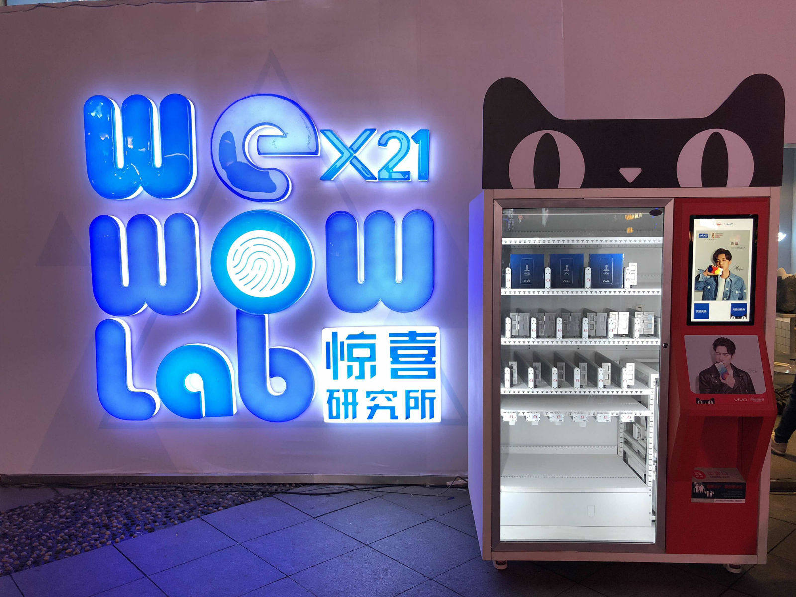 实际上,这是vivo和天猫在长沙黄兴路步行的街头开的一家快闪店,也是全球首款可直接售卖手机的“无人贩卖机”,vivo x21新品系列便可通过该渠道实现购买。