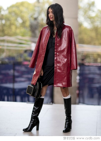 包臀短裙的选择很多,其中延续了单排扣牛仔半裙元素的漆皮包臀裙最带感,只不过把单排扣换成了拉链,正好与个性冷峻的漆皮面料相呼应。