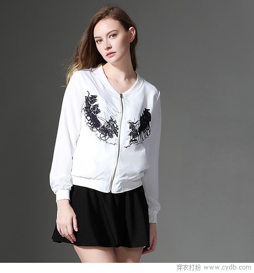 04 如果是作为单穿,棒球服也可以打开新世界的大门。贴布印花款算不上惊喜,如果一件做外套,一件做腰上的装饰呢?或者直接将拉链做出露肩的感觉,搭一件简单的宽肩带背心,是妩媚的矜持感。
